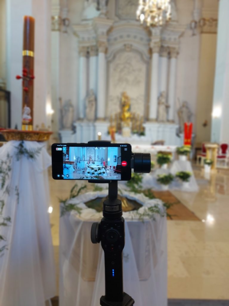 Tak wygląda transmisja 'od kuchni’. A właściwie wypadałoby napisać od zakrystii. Telefon i statyw, więc nic profesjonalnego, lecz staramy się by podczas każdej Mszy Świętej był jak najlepszy dźwięk i obraz. Niestety często napotykamy na małe przeciwności. A to facebook i problemy z udostępnianiem, internet, który zakłóca transmisje, słońce, które często prześwietla obraz, mocny pogłos…